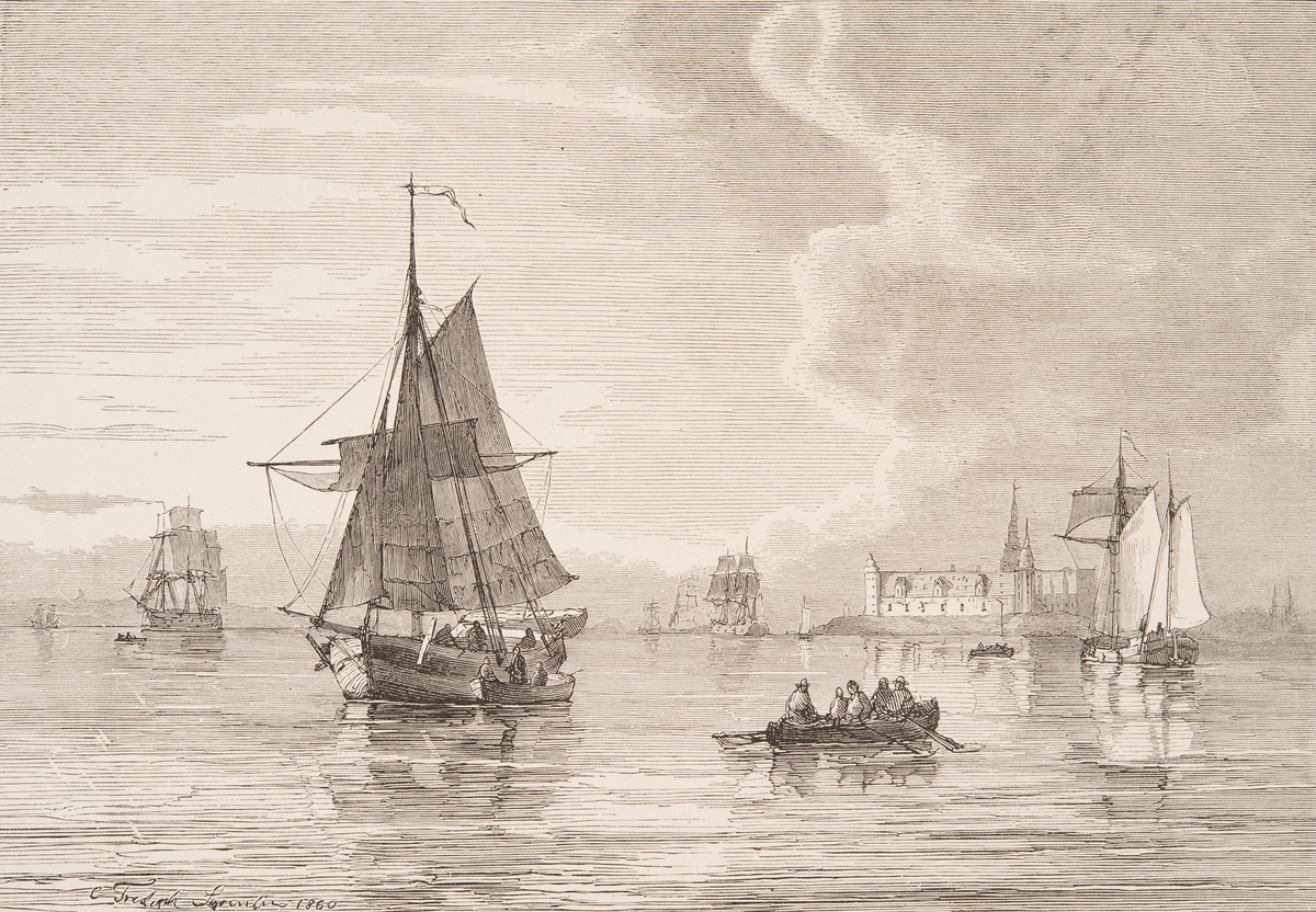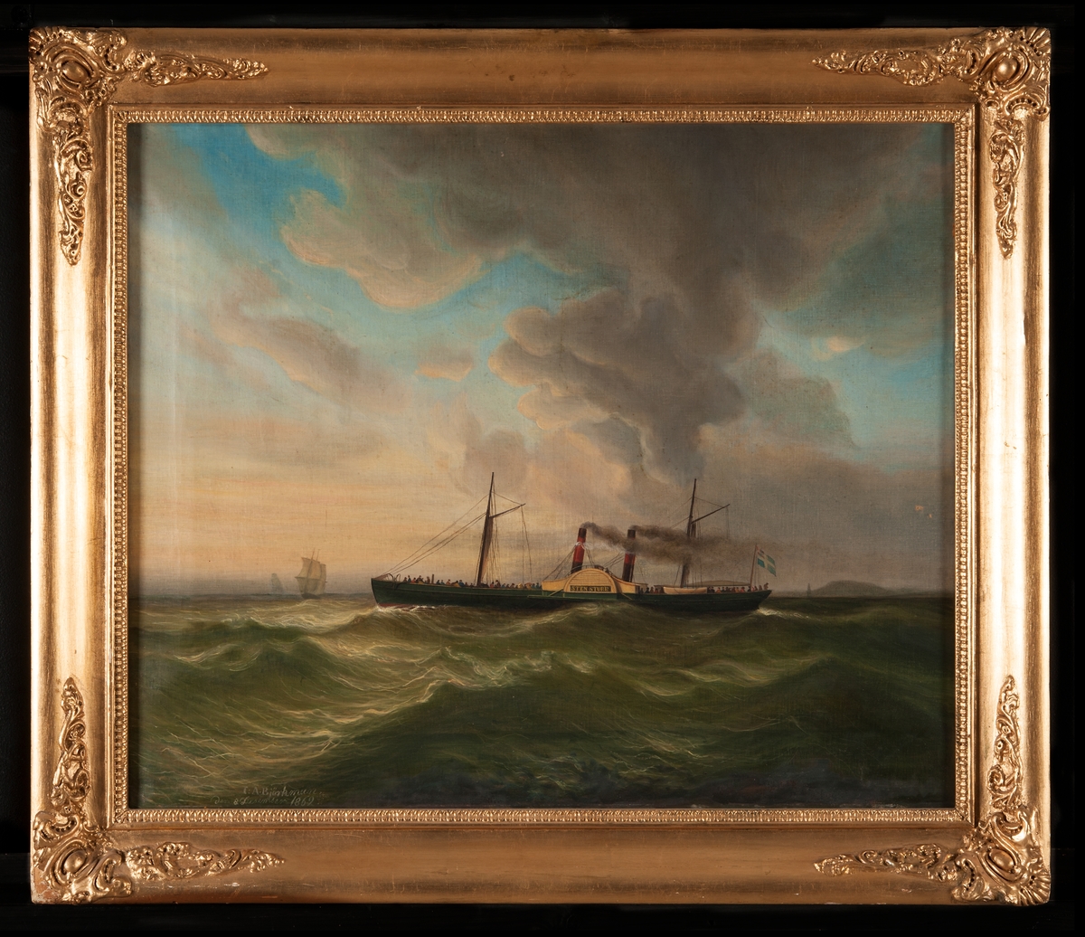 Shakespeare Cliff, Dover, 1849. A composition in which the artist has incorporated recognizable features at Dover, about 1849, with imaginary narrative. The painting falls into two parts with a brig shown on the left amidst dark clouds and a stormy sea. I