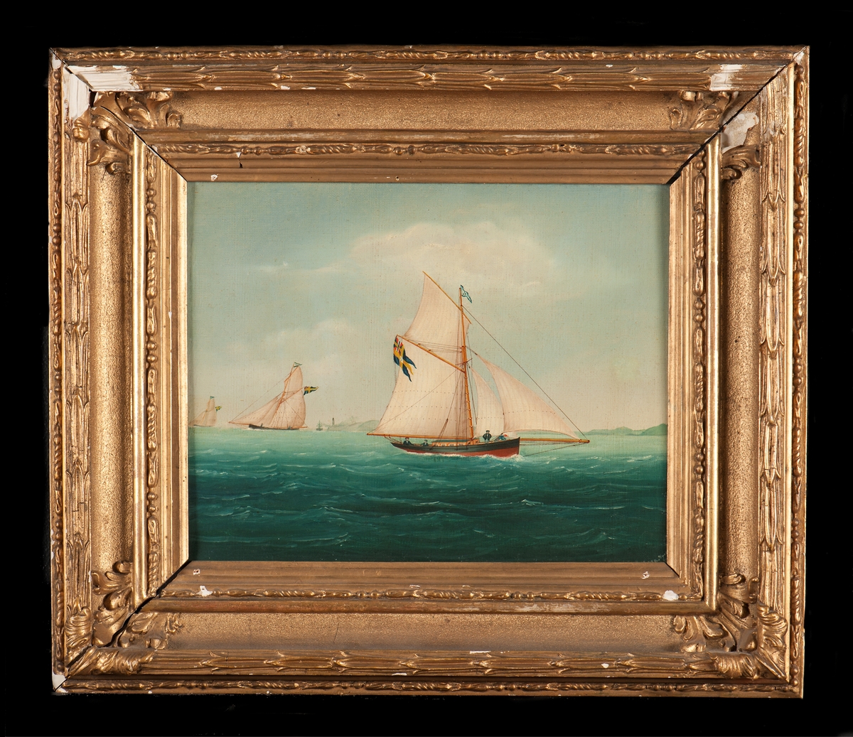 A two-decker at Naples. Ship portrait. Oil painting by A. de Simone, showing a Royal Naval two-decker of at least 90 guns making sail southward from the Bay of Naples. Another British two-decker is following, possibly under a Vice-Admiral of the Blue (si
