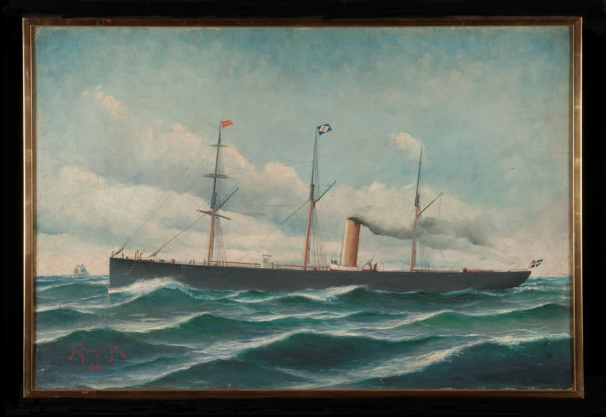 Majestic. This coloured lithograph depicts the steam passenger liner ‘Majestic’ at sea, sailing in a rough ocean. This vessel was in service with the White Star Line, and launched in 1889. Though a steam ship, she was also fitted with sails be