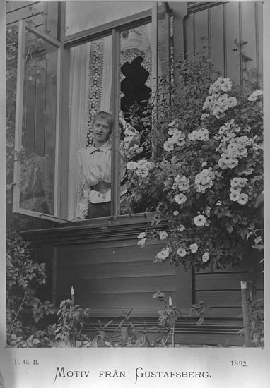 Kvinna står med öppet fönster. Blommor på väggen.