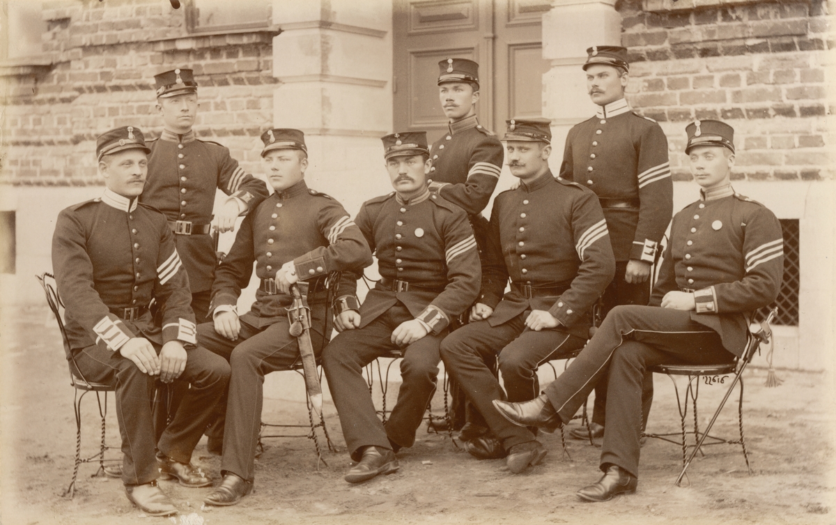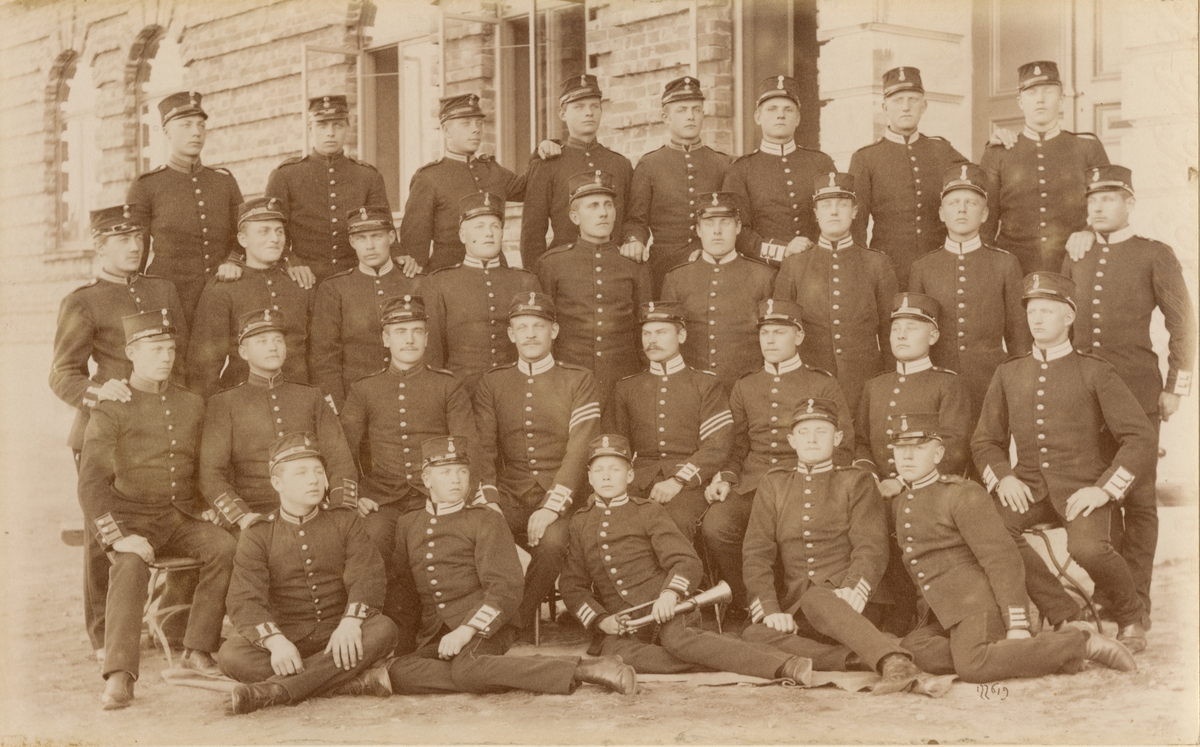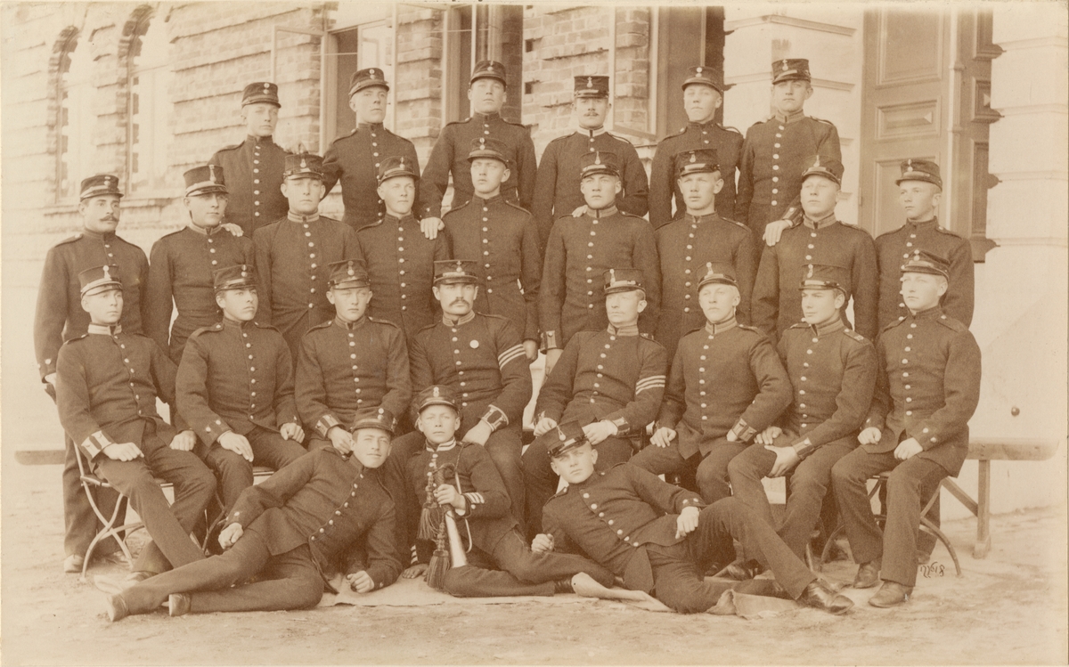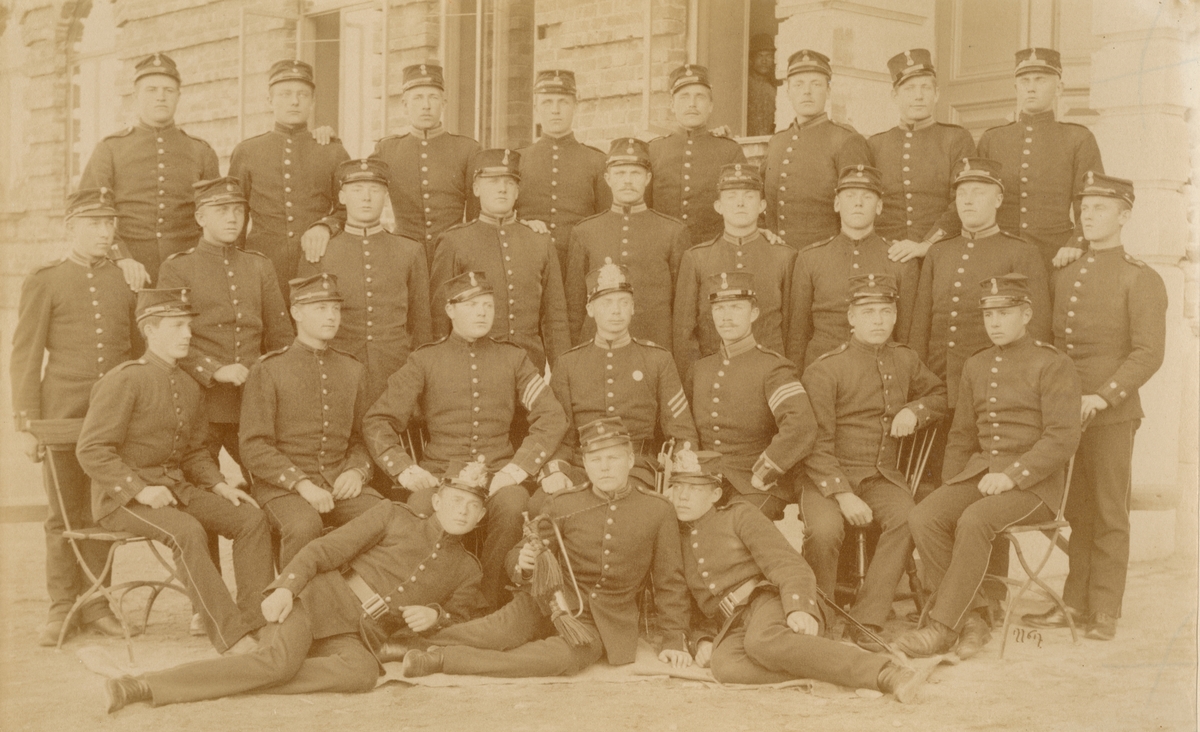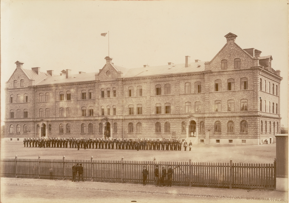 Andra livgrenadjärregementet I 5 står uppställt utanför kasernbyggnad. Två kvinnor står i dörröppning i bakgrunden och i förgrunden står barn och ungdomar och tittar på.