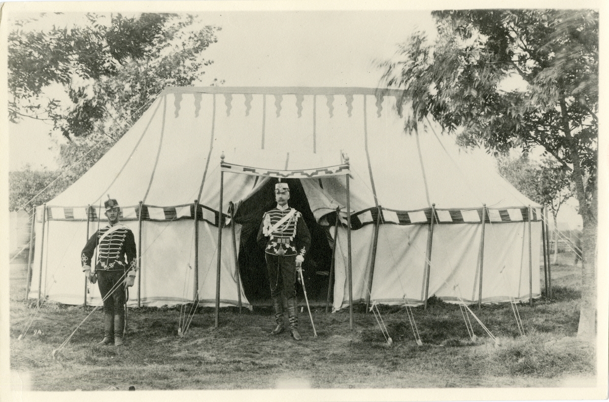 Livregementets husarer. Husarlägret på Sanna hed 1894. Prins Eugen utanför sitt tält. Han tjänstgjorde inte under hela sommaren, utan endast under mötena och hade ingen egen stuga.