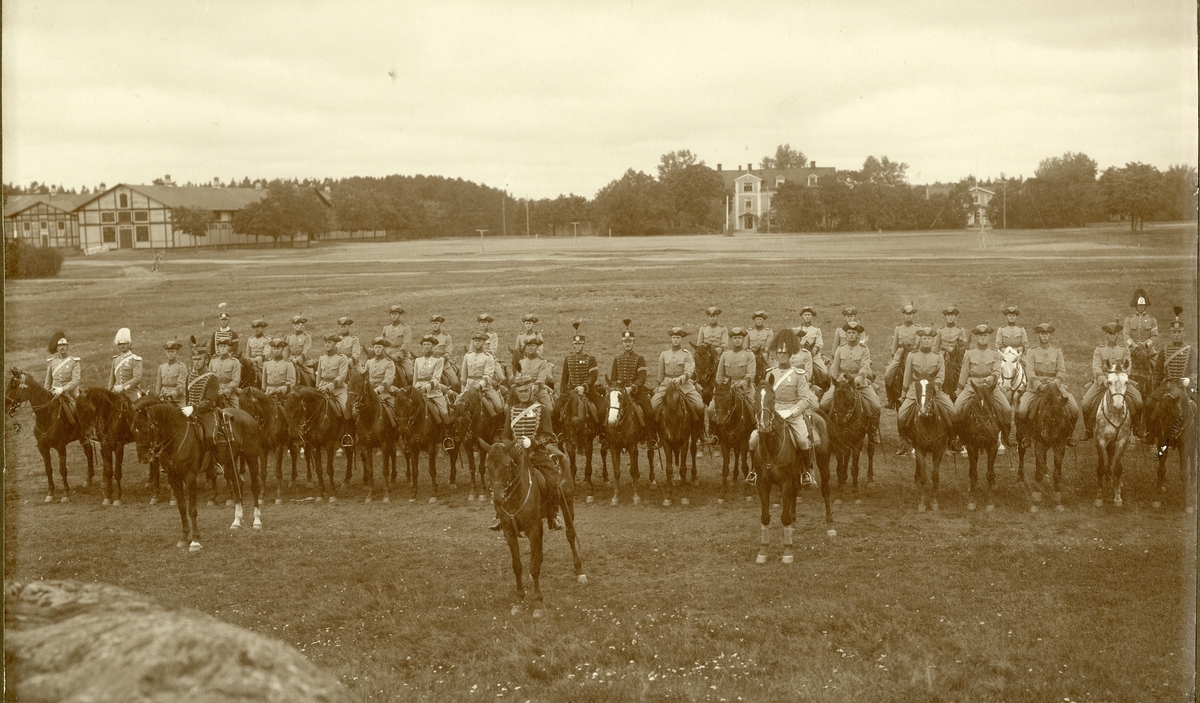 Östra Nerikes skvadron på Sanna Hed midsommar 1894. Se majstången över västra Nerikes stalltak.