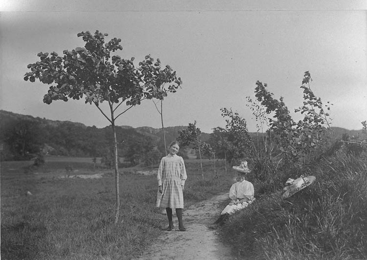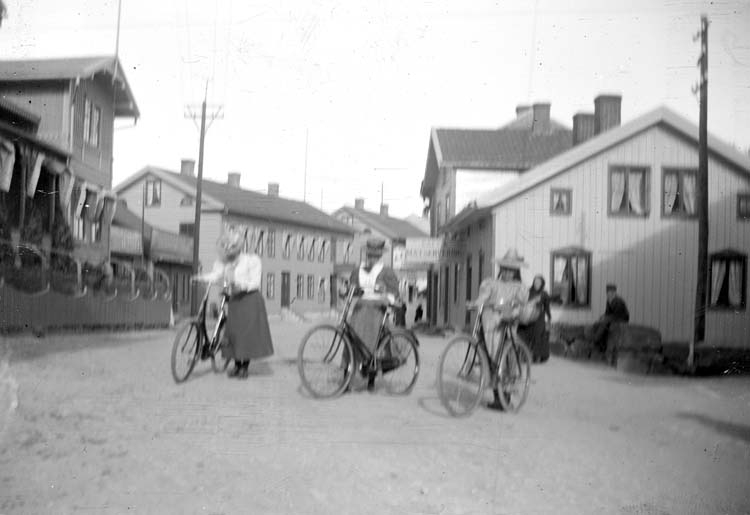 Enligt text som medföljde bilden: "Lysekil. Ruth, Elna o. Anita på Velociped.