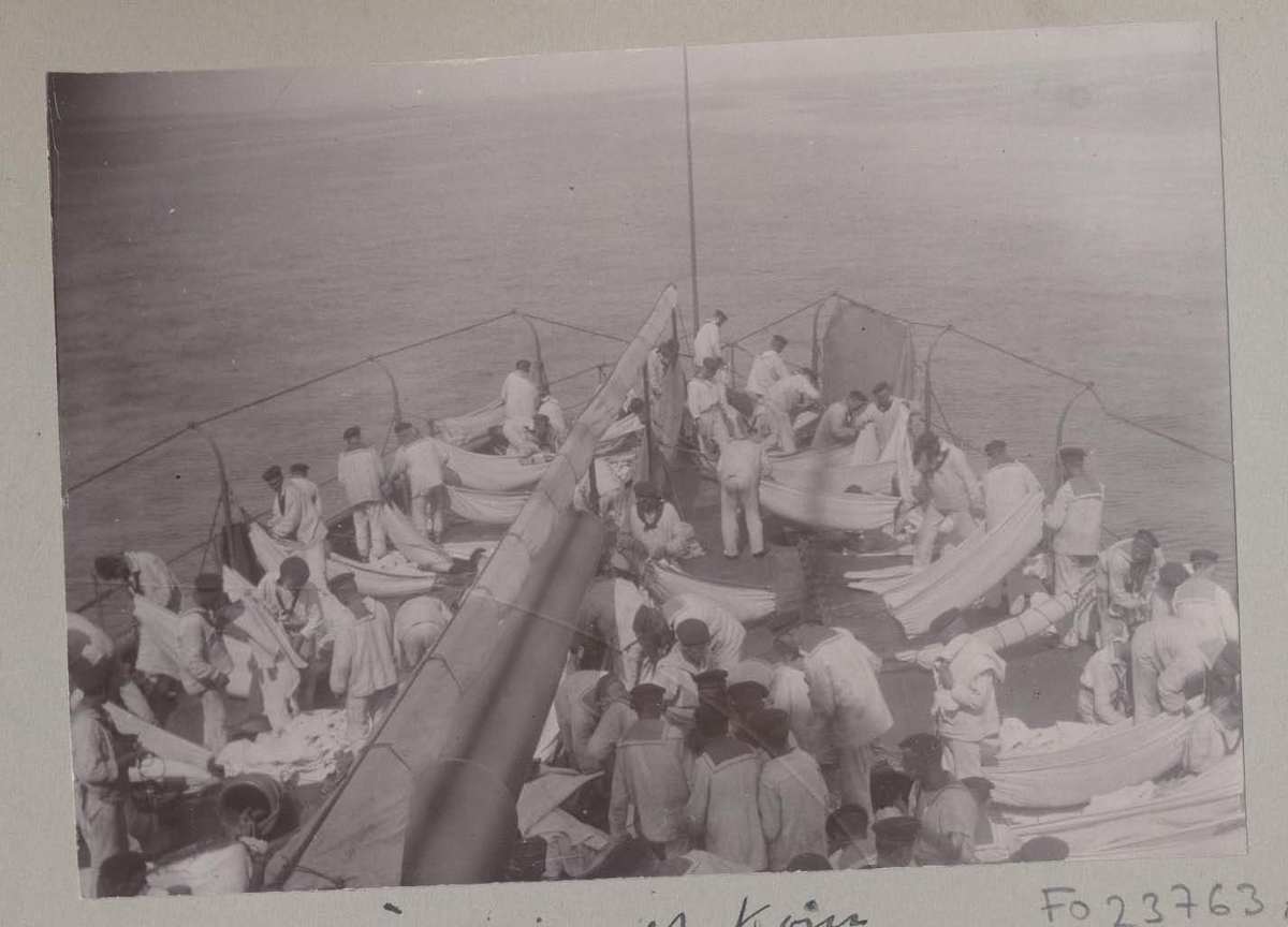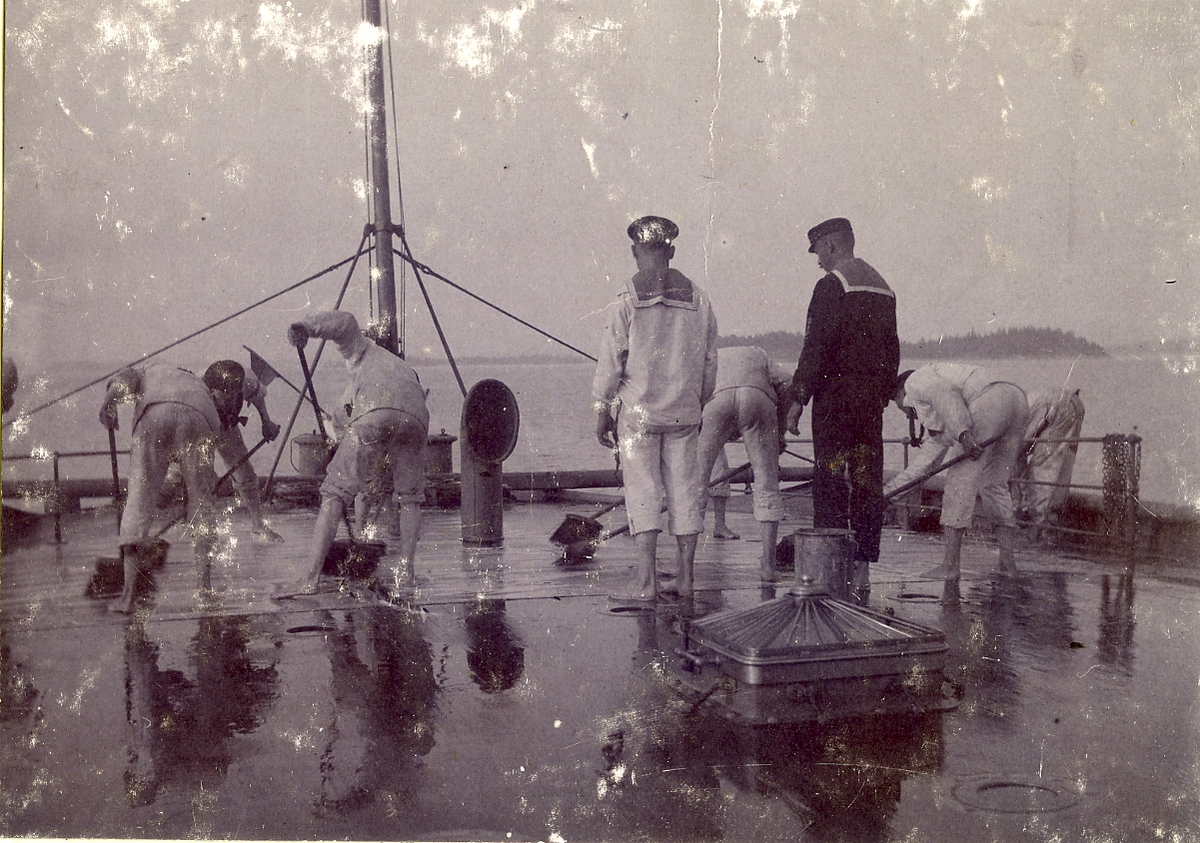 Kusteskadern 11/8 - 1/10 1898. Däcket skuras. Chef: KKl J.W.L. Sidner, Sek: Kapt. A. Ekström.