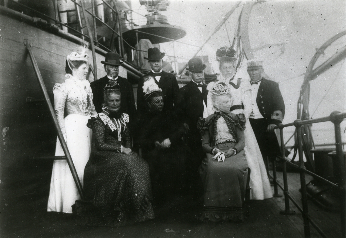 Ombord på H.M.S. Oden 1898. Stående fr.v.: 1. Grevinnan Alarik Wachtmeister, född frih. von Otter. 2. Landshövding Hans Wachtmeister. 3. Statsrådet Hans Hanson Wachtmeister. 4. Landshövding Gotthard Wachtmeister. 5. Fr&oum