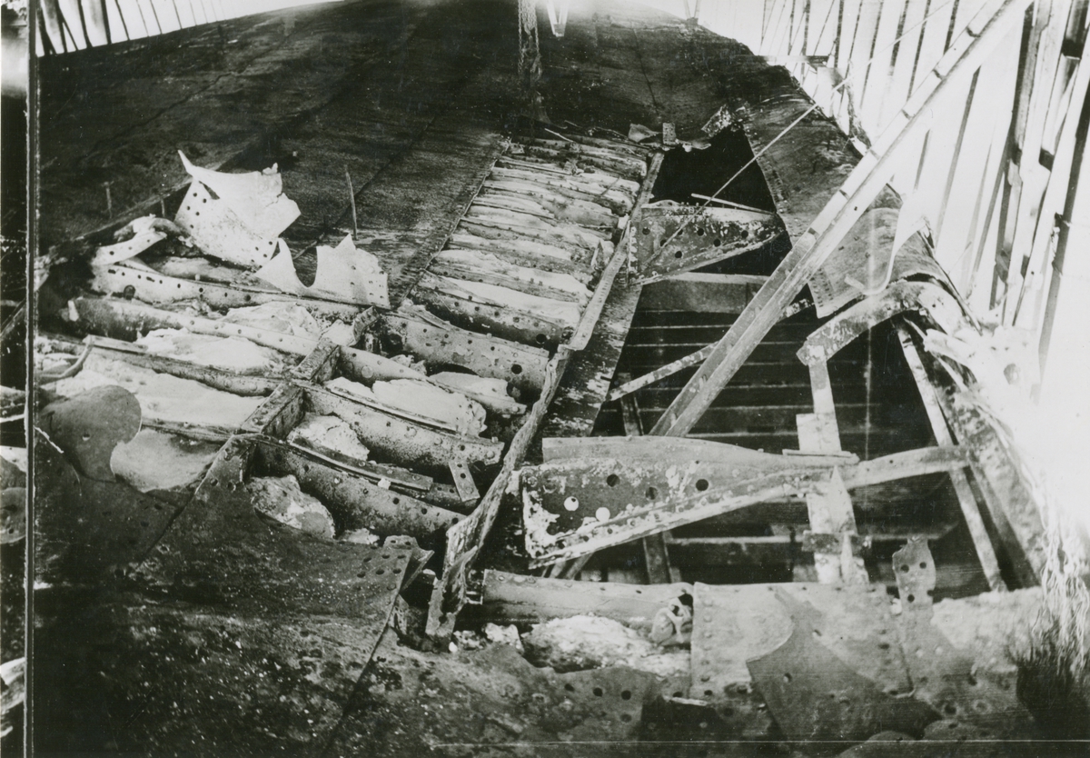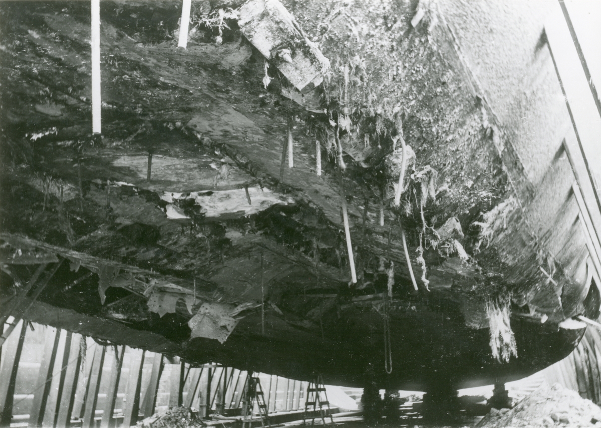 Foto visande bottenskador på post-pch passagerarångfartyget CHINA av London, som onsdagen den 25 mars 1898 ränt upp på klipporna vid Perim i Röda Havet.