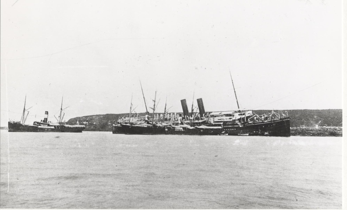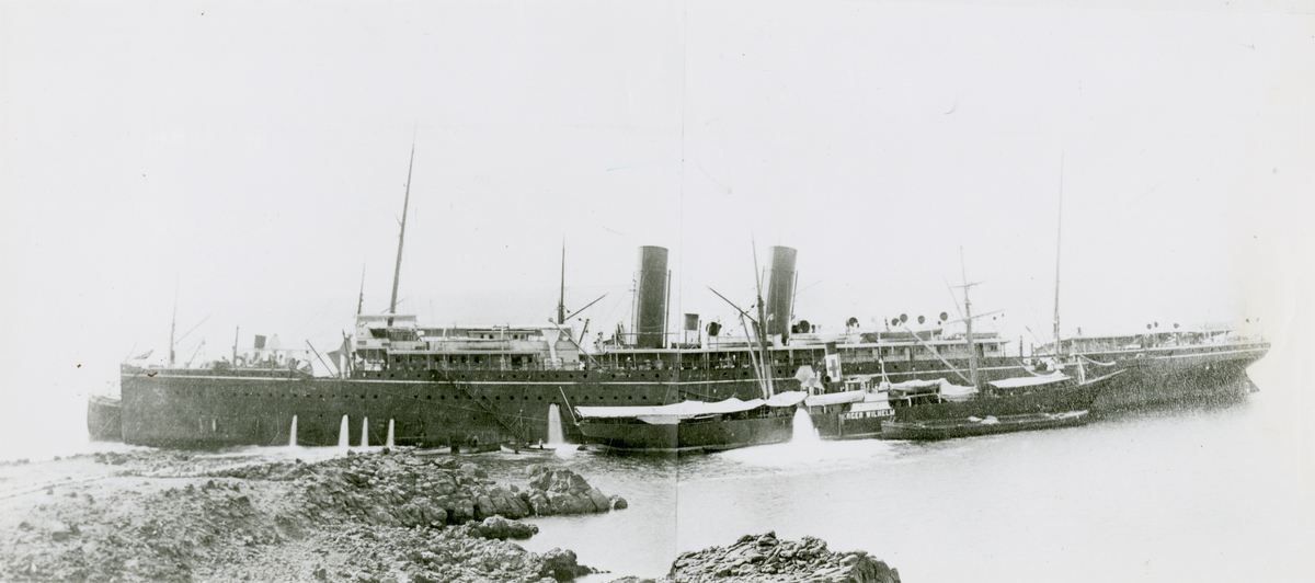 Foto visande post-pch passagerarångfartyget CHINA av London på strandningsplatsen med HERAKLES, BERTHILDE och BERGER WILHELM.
