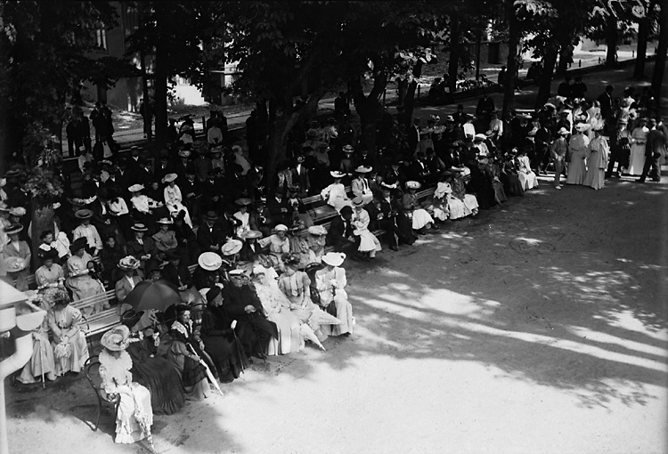 Kung Oscar II, i rock och sjömansmössa, avnjuter konsert i Badhusparken, omgiven av societetsdamer, bl a de s.k. "kungsflundrorna" (grevinnan Mathilde De la Gardie, generalskan Lotten Abelin och hovmarskalkinnan Anastasia "Stassa&