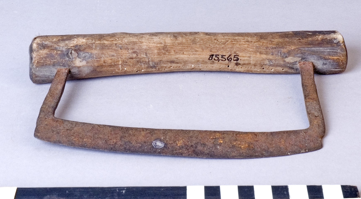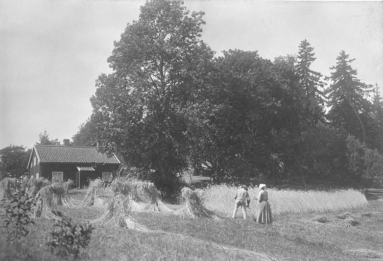 En man som slår med lie och en kvinna som binder neker och sätter upp i skyl.