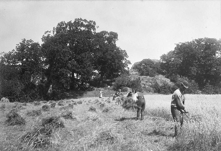 Lantarbetare som slår säd med lie, och binder neker som sätts upp i skyl.