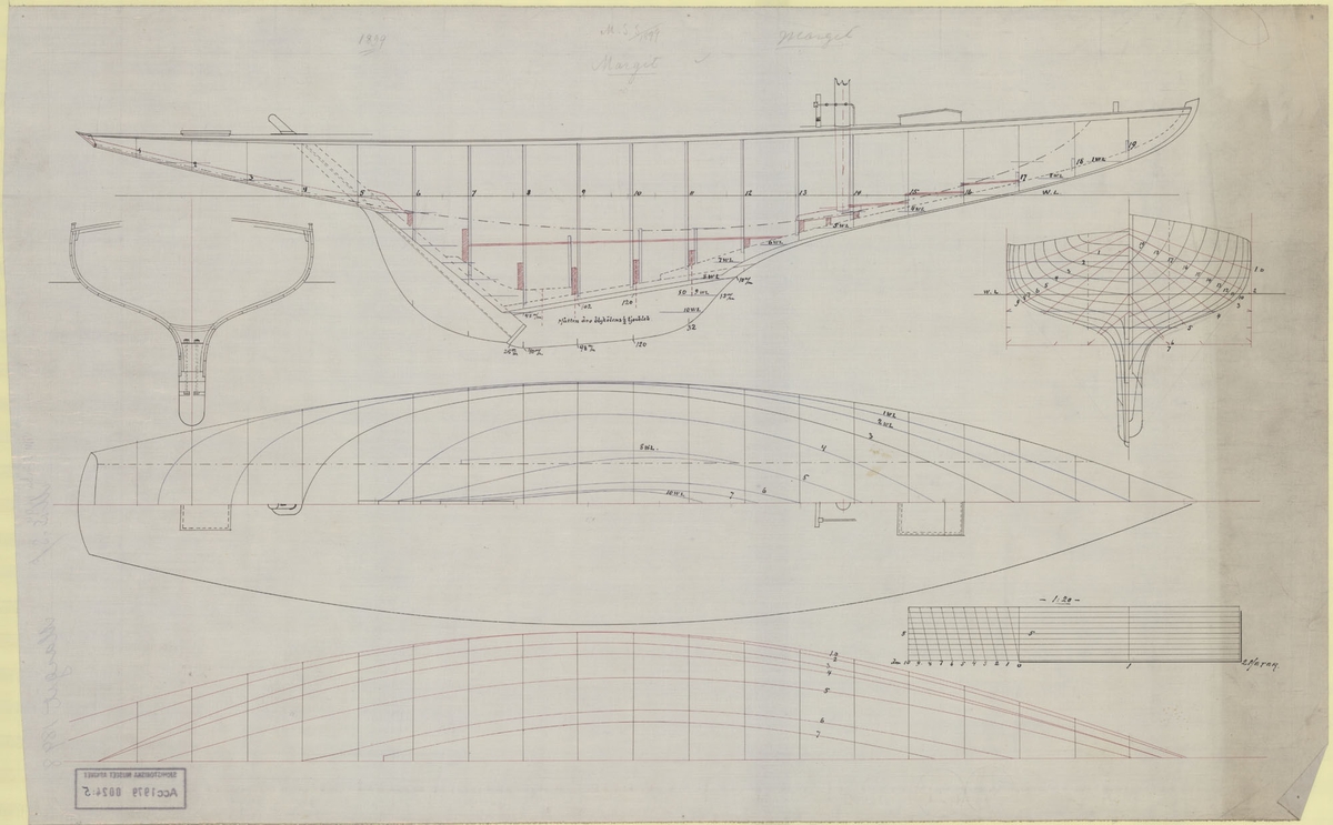 Nereus. Scale: Unknown. A half block model of the yawl, Nereus (1899) made entirely of wood in bread and butter fashion. The lower section of the hull has been painted a light green colour above which is a thin horizontal band of white paint with a black