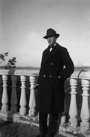 Alvar Nilsson klädd i överrock och hatt, på utsiktsplatsen "Brittania", Backudden.