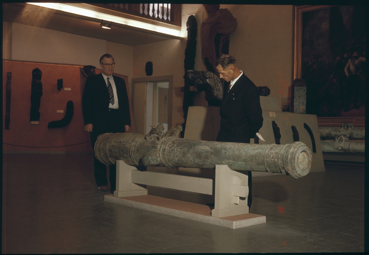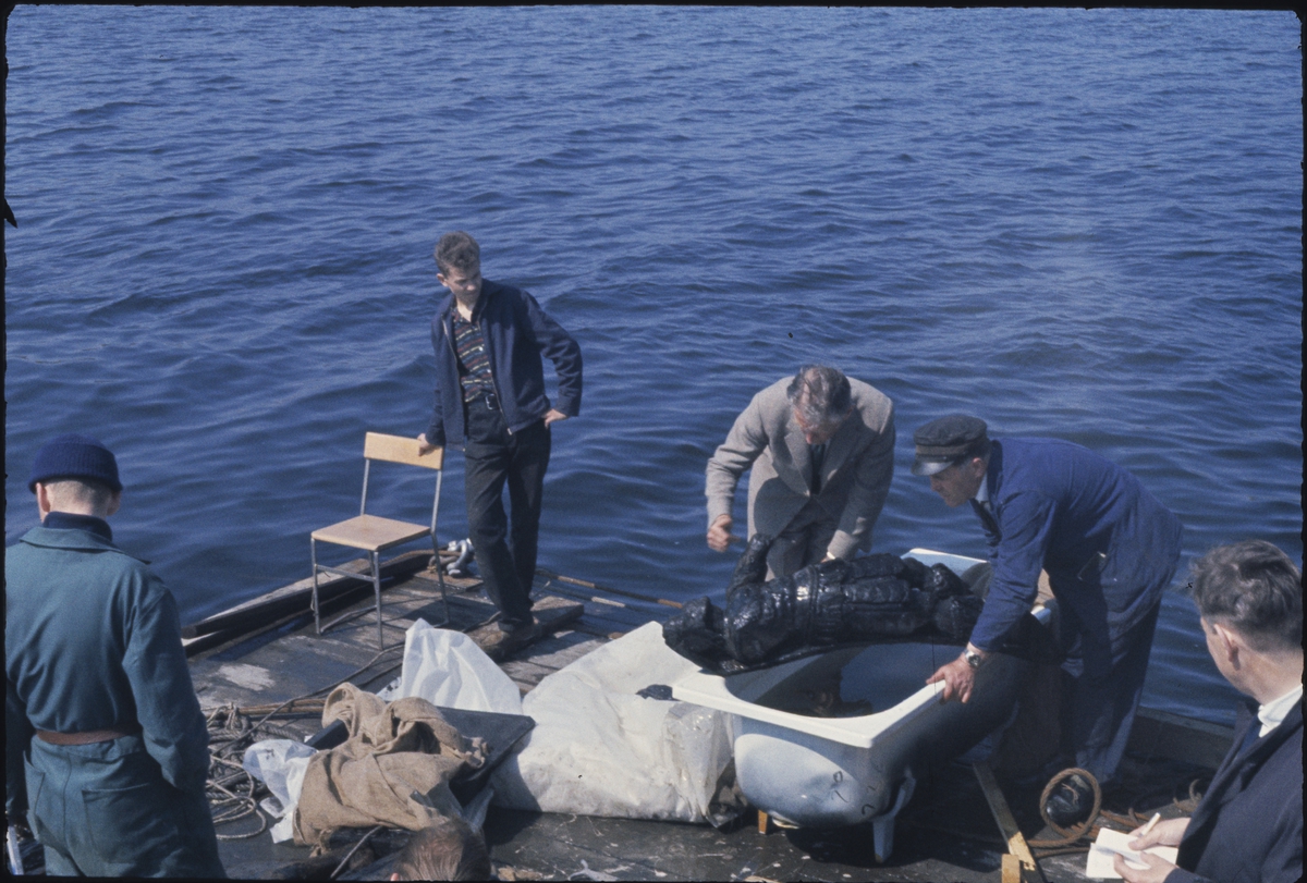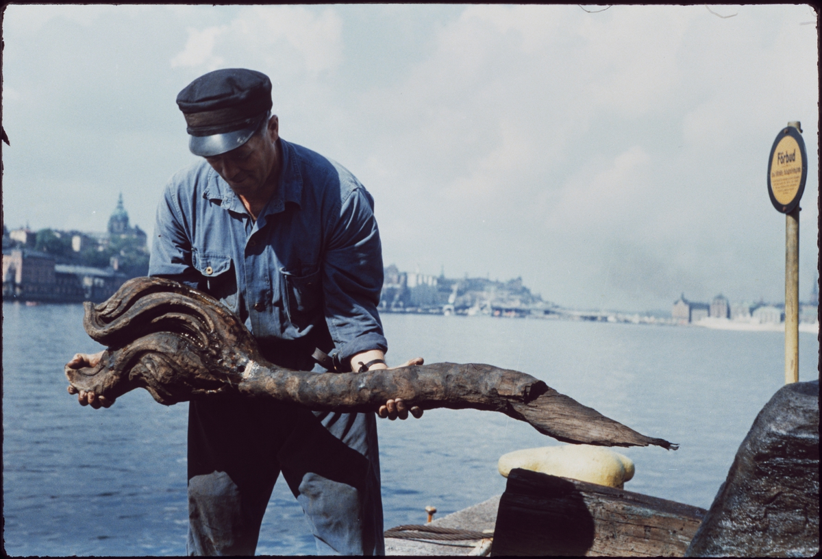 Från utställningen av skulpturer från Vasa i Sjöhistoriska museets minneshall hösten 1959.