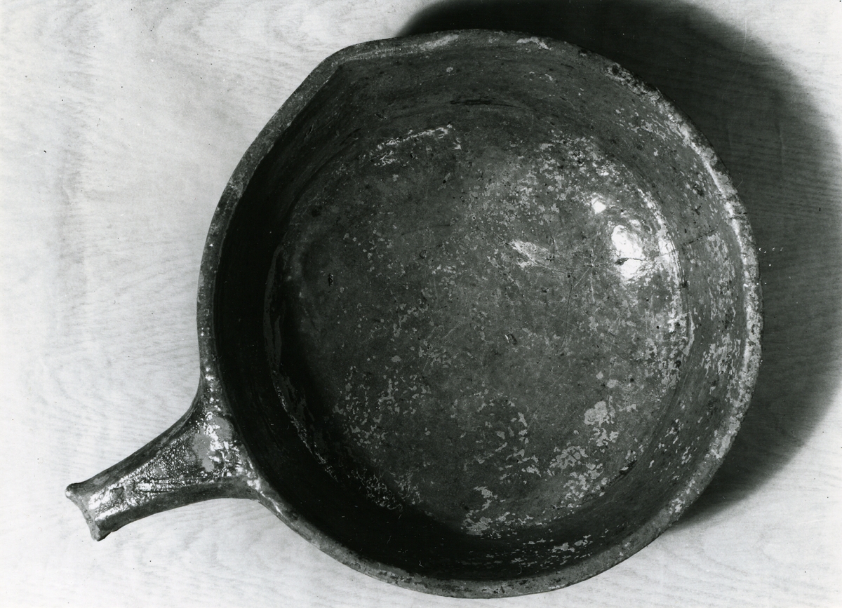Stekfat med handtag och tre små fötter av rött lergods, glaserat brunt inuti och längs yttersidan, inte på undersidan.