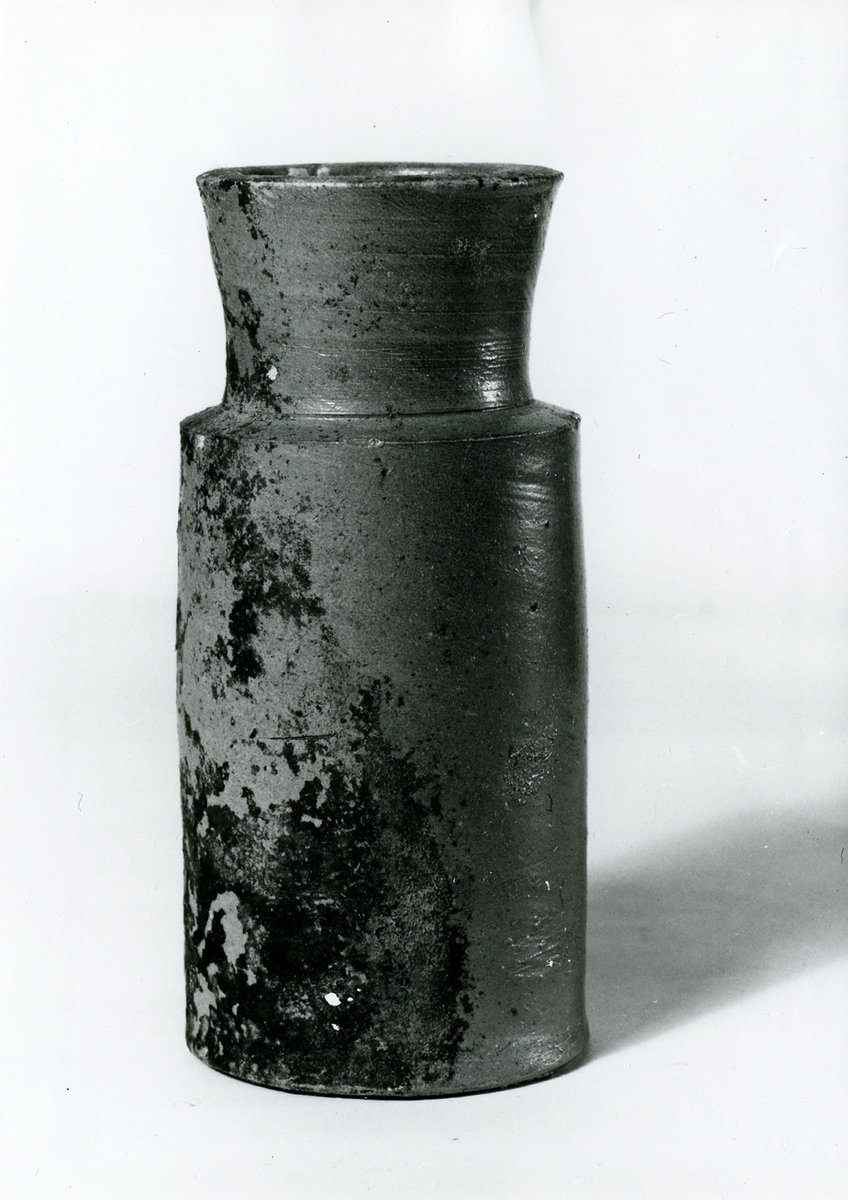 "Utvändigt brunt glaserad. Längd 13 cm, mynningsdiam. 5,5 cm, bottendiam. 6 cm. Engelsk "ink-bottle"1800-ta