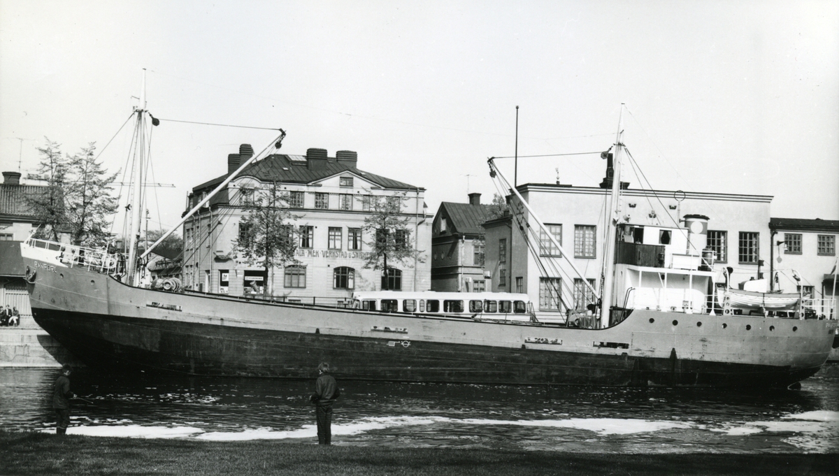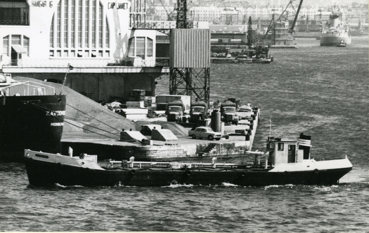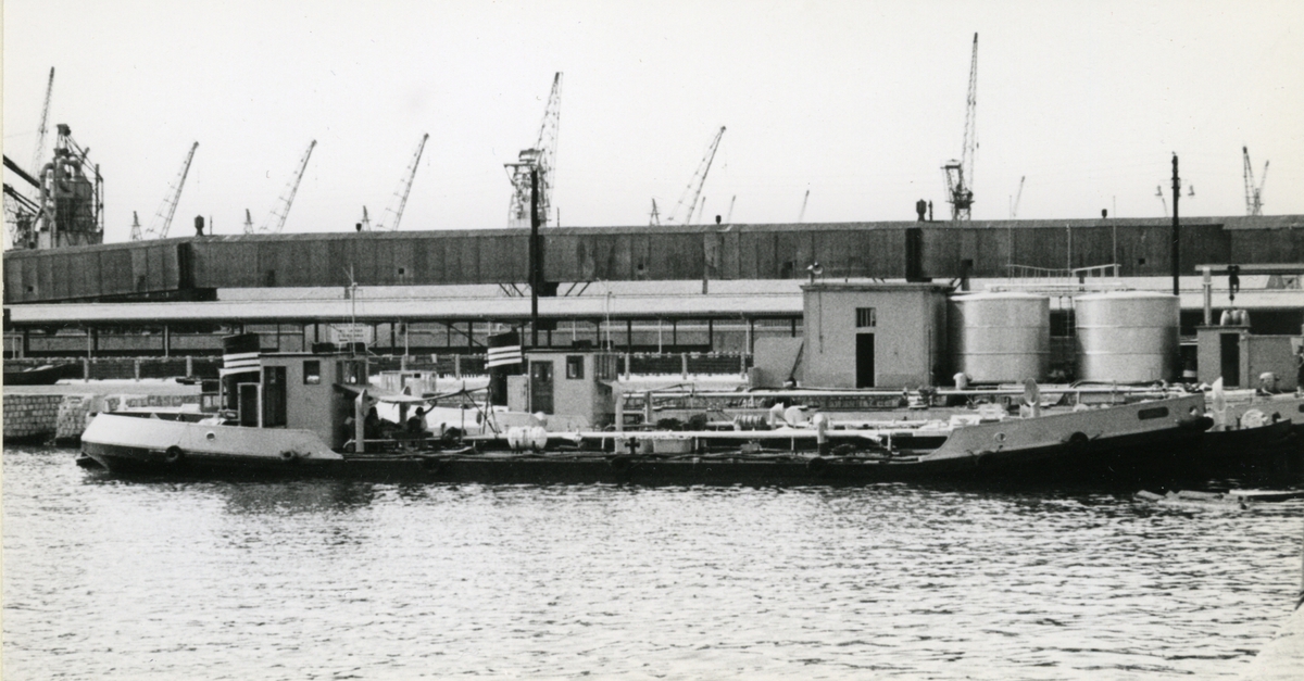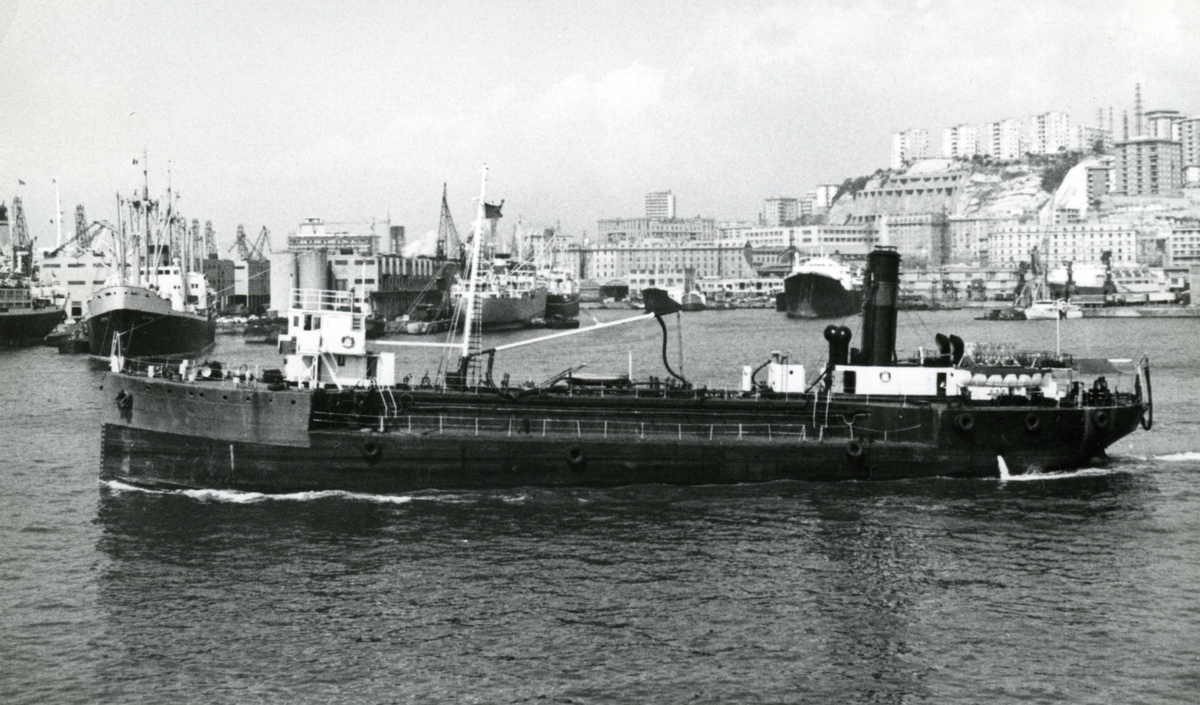 Foto visande tankmotorfartyget "BERGBRITT" av Stockholm, vid kaj i Värtahamnen, Stockholm, 1968.