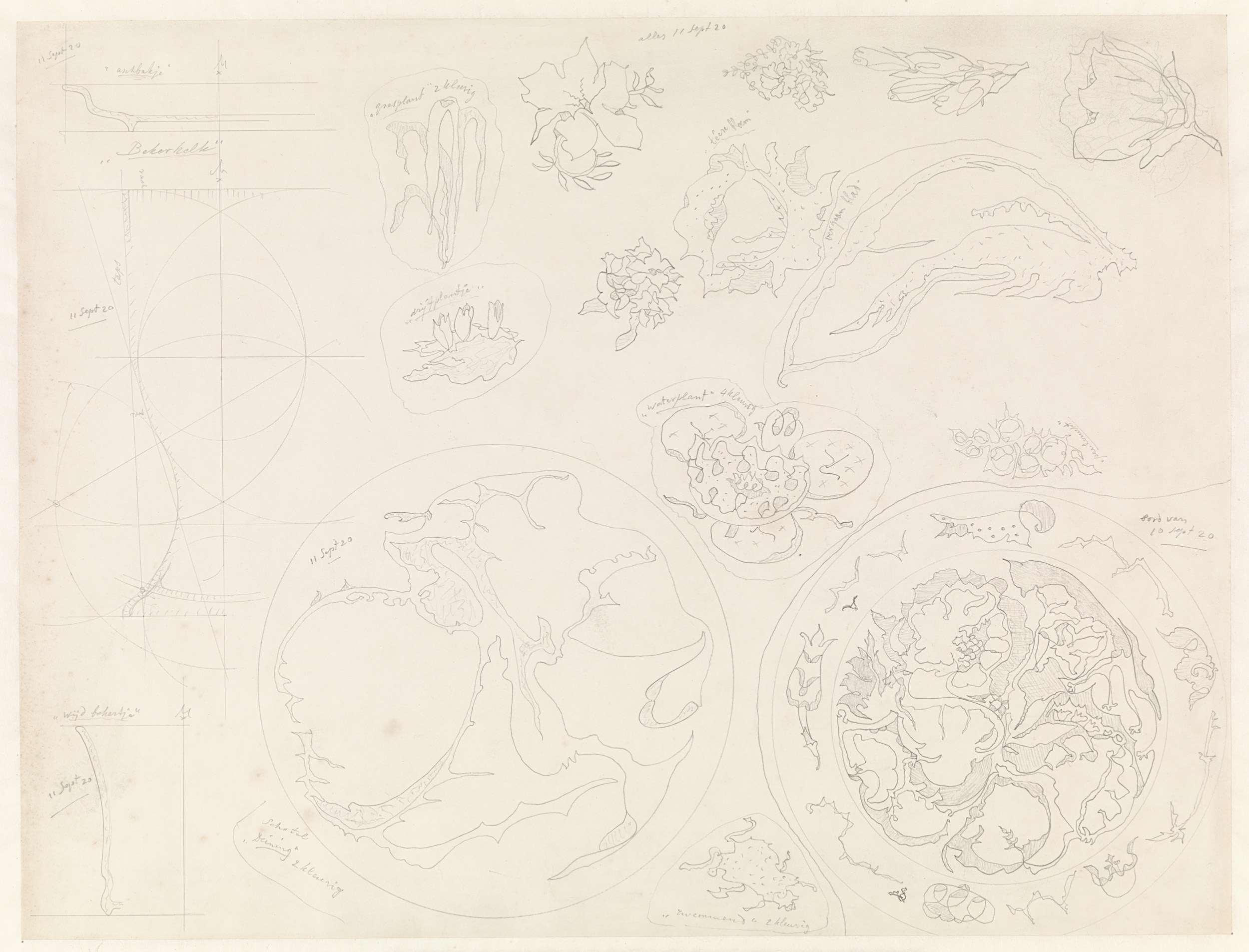 Zes ontwerpen Iseger in halfprofiel voor vazen en kommen en drie bloemmotieven