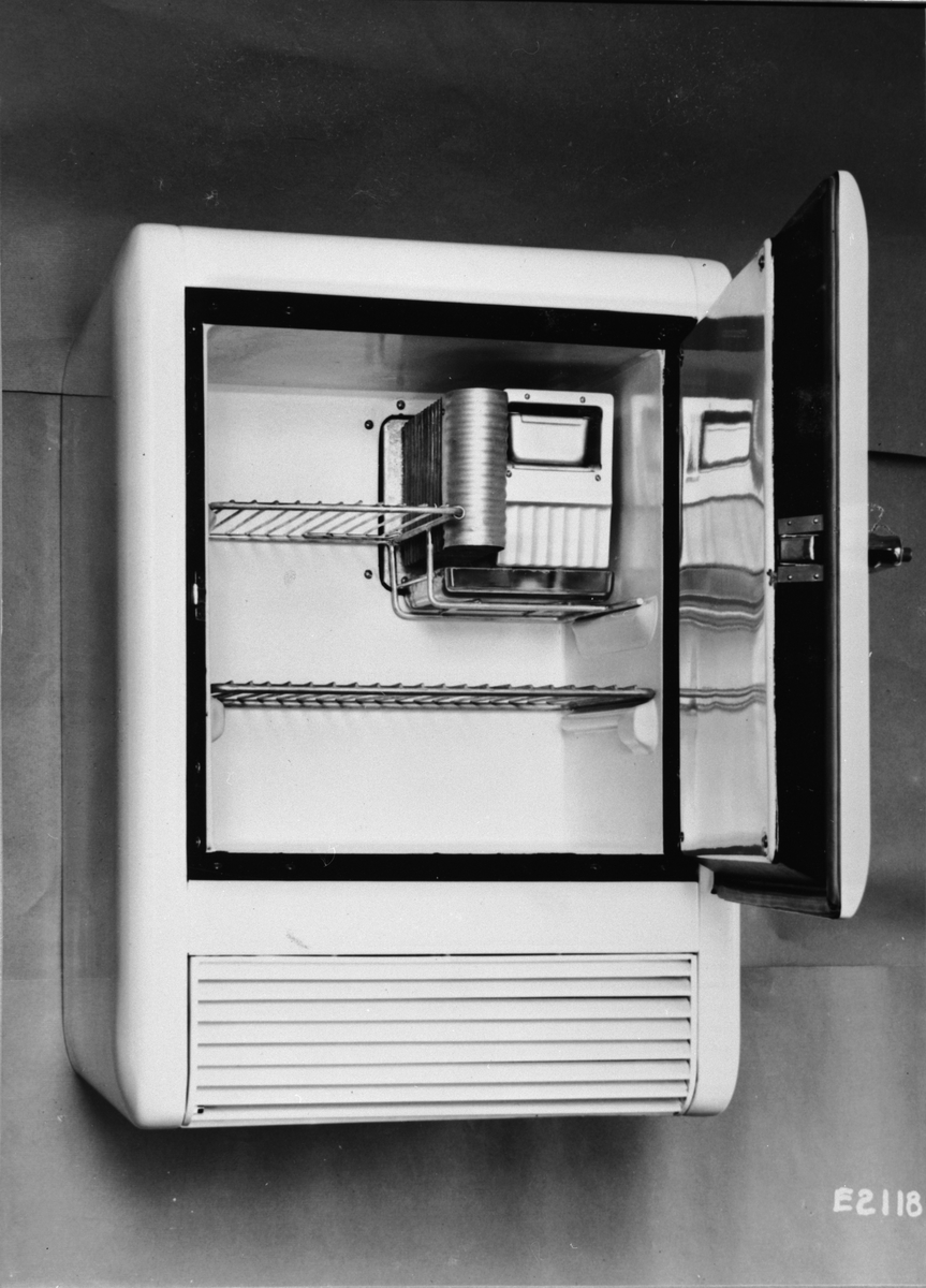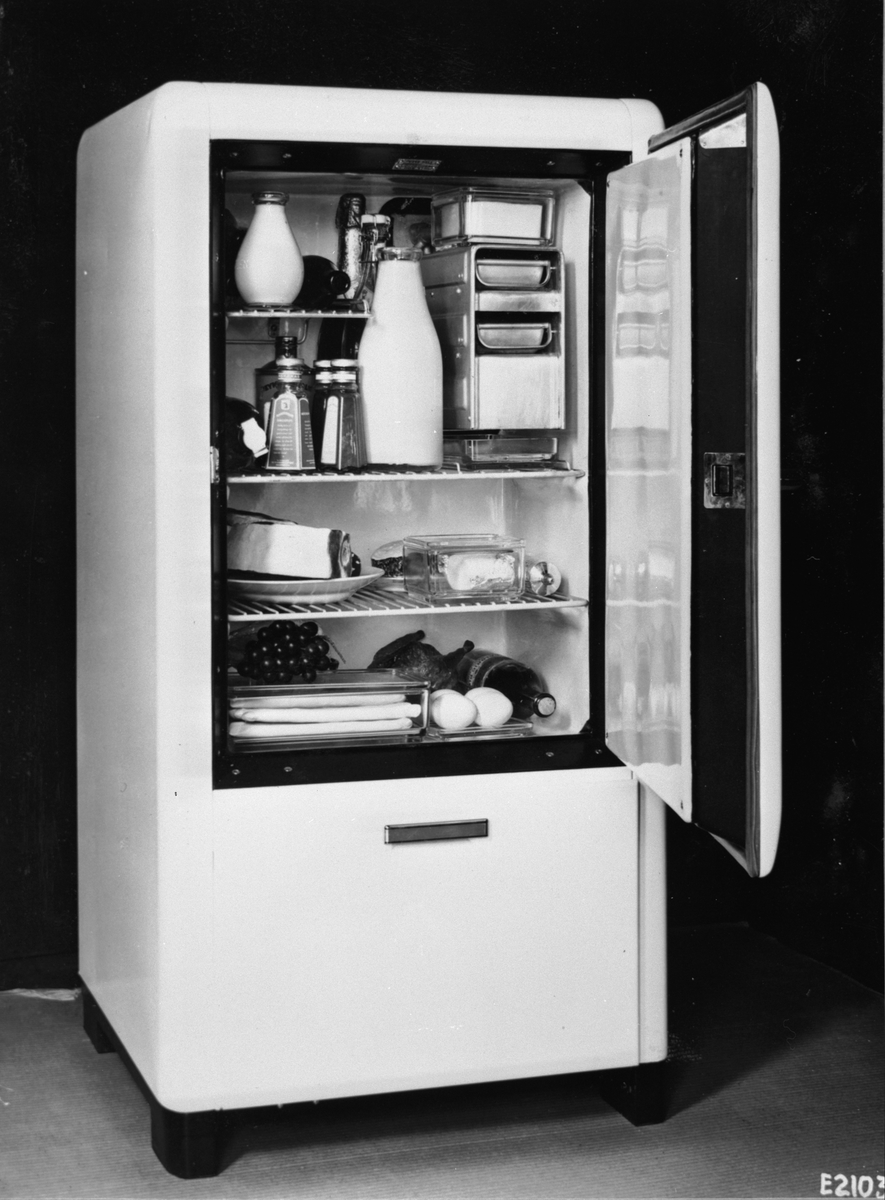 Det första kylskåp med värmedrift L 300, öppet med mat. -Ny typ av radiatorkonstruktion med sprutade aluminiumprofiler. (Edlund).