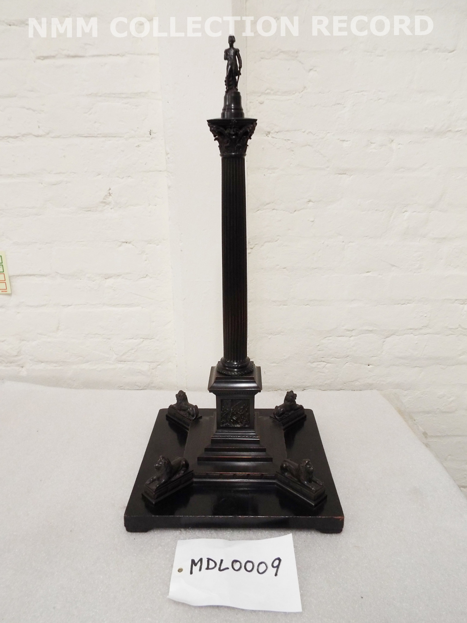 Nelson's Column. Model of Nelson's Column in bronze on a square ebonized wooden base. It shows the memorial as designed by the architect William Railton and the sculptor E. H. Baily (1788-1867) including Edwin Landseer's four lions added in