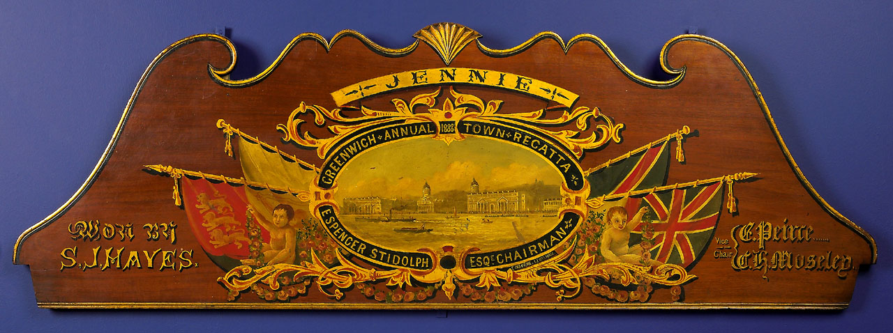 . Decorated skiff backboards were often awarded as prizes at 19th-century Thames regattas. This mahogany backboard, painted with the City of London arms, is from the winning skiff at Greenwich Regatta, held on 26 July 1852. It was won by John Griffiths of