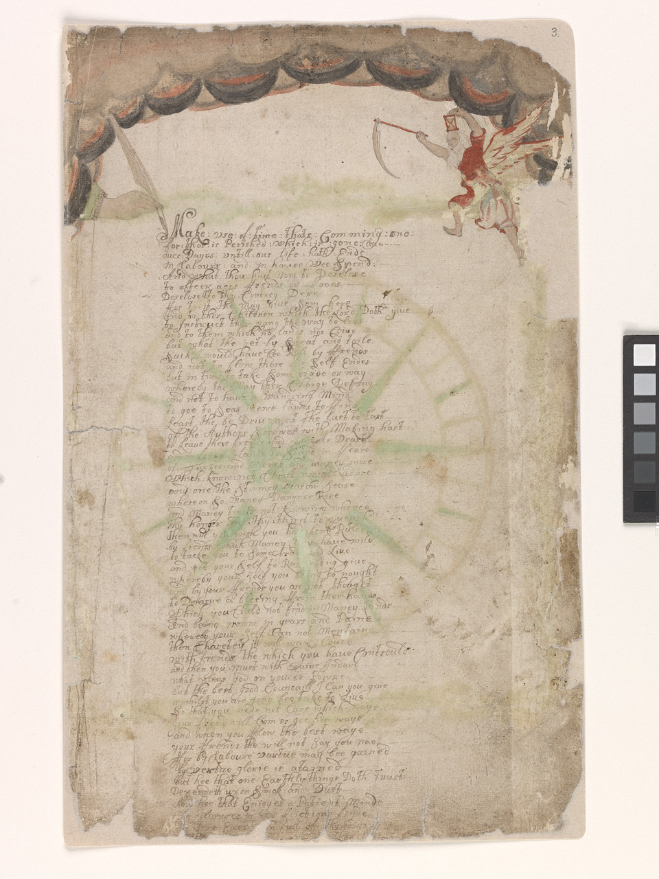 Poem 'make use of time comming: one: for that is perished: which is gone.'. Includes watercolour of presumably old father time with an hourglass on his head, a scythe and with angel wings. Also is a hand painted on the lefthandside with quill pe
