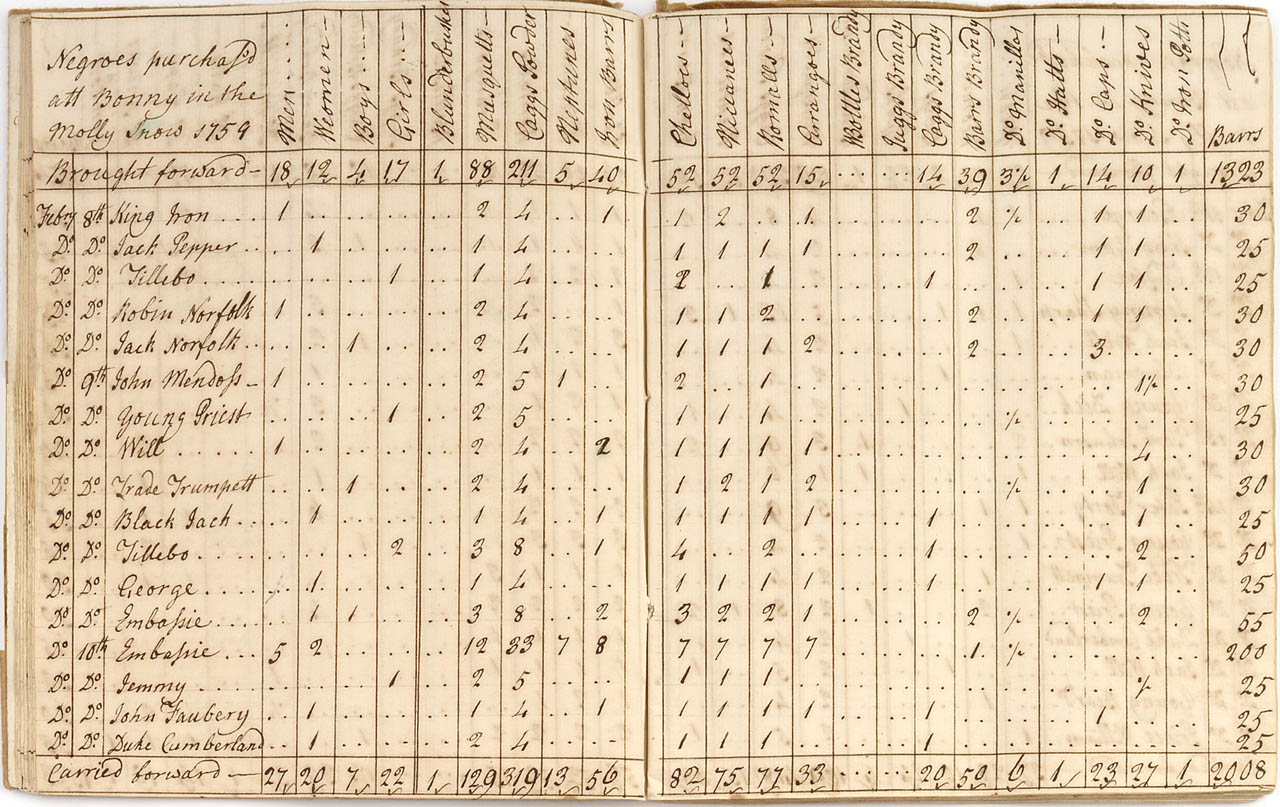 An account book of the slave ship MOLLY at Bonny Island.. The account book was kept between 1 February 1759 and 27 April 1759. The accounts includes cargo bound for Bonny; list of bills played at Bonny; 286 Africans purchased at Bonny including 125 men, 1