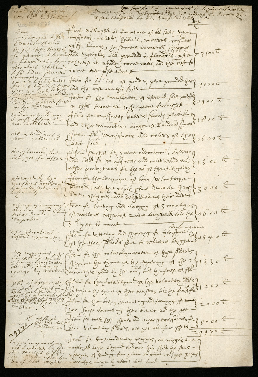 Norris accounts.. A 'note of such somes of money as Sir. John Norreys rapoteth to have disboursed for Armes, &c', December (?) 1588.