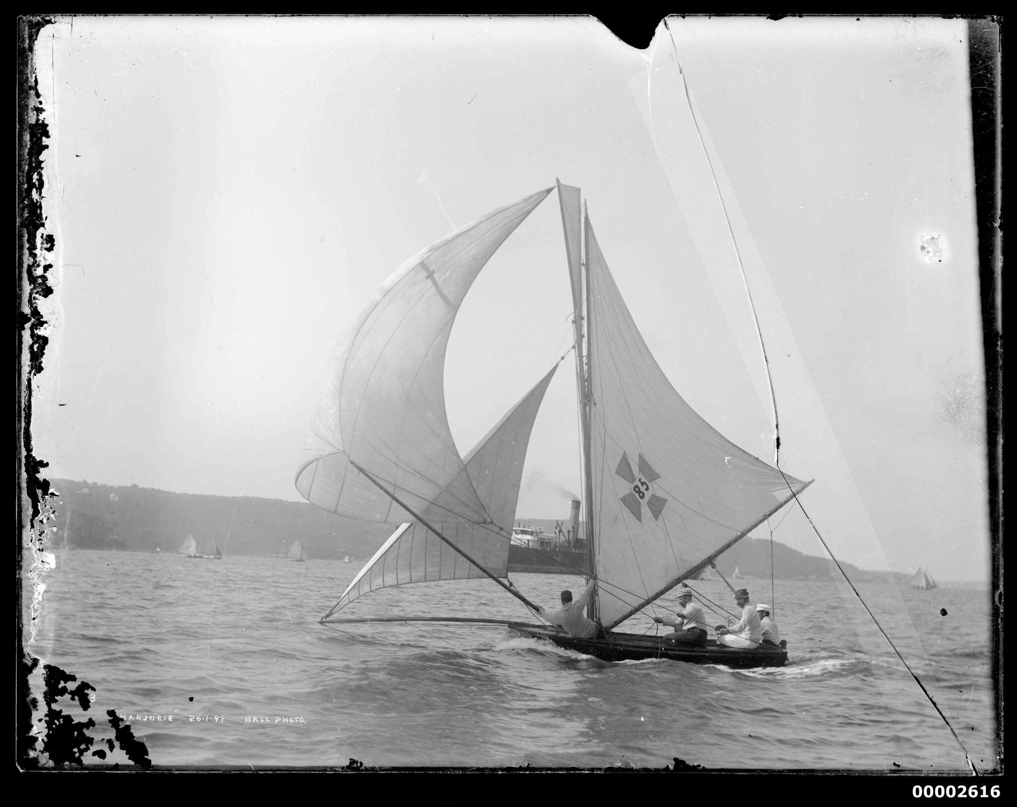 Skiff on Sydney Harbour, probably participating in Anniversary Day Regatta