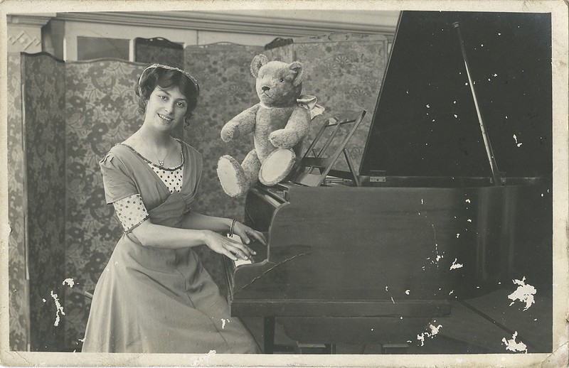 Photographic postcard of a woman, possibly actress Marjorie Neil, and toy bear at a piano