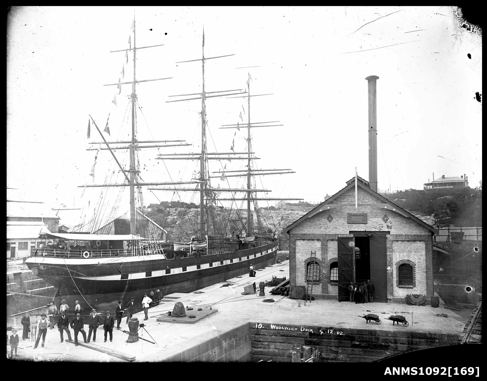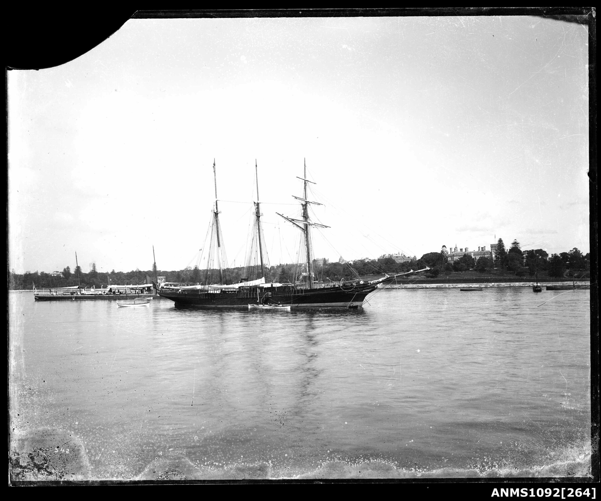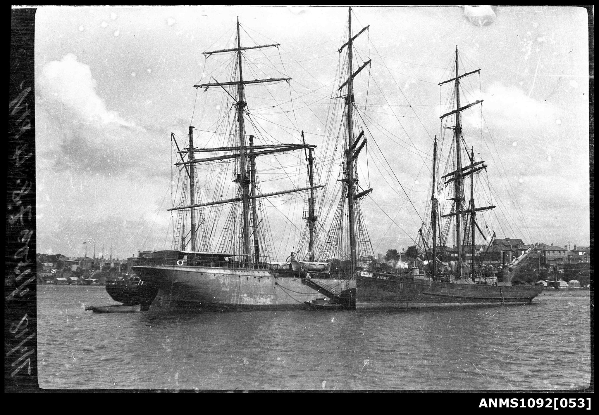Two-masted schooner SYDNEY moored alongside a three-masted fully rigged ship, Sydney Harbour