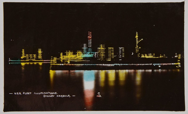 HMAS Sydney illuminated at night during the week after the entry of the first Royal Australian Navy Fleet into Sydney Harbour October 4 1913
