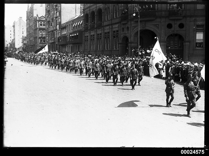 Australian Army soldiers marching along Macquarie Street, Sydney