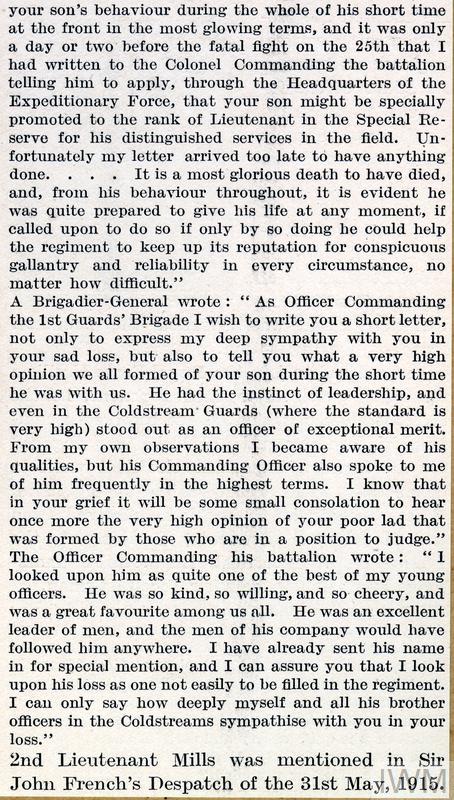Second Lieutenant Charles Gordon Mills MID. Unit: 1st Company, 1st Battalion, Coldstream Guards. Death: 25 January 1915, La Basse, Western Front.
