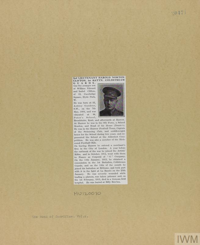 Second Lieutenant Harold Norton Clifton. Unit: 1st Battalion, Coldstream Guards. Death: 01 February 1915 Died of wounds Western Front