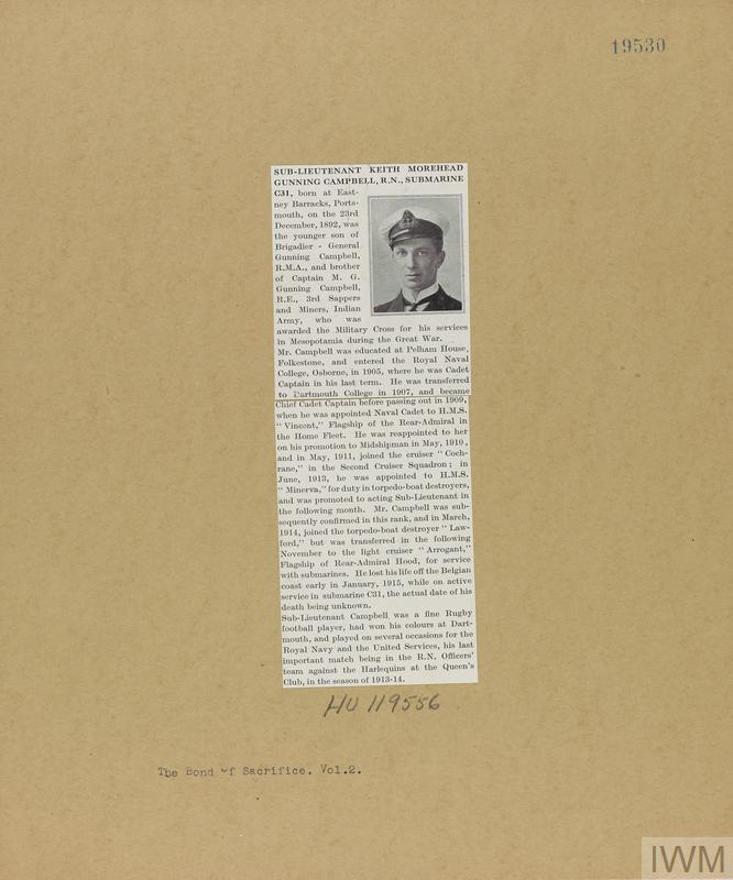 Sub Lieutenant Keith Morehead Gunning Campbell. Unit: Royal Navy, Submarine C31. Death: 07 January 1915 off the Belgian Coast English Channel