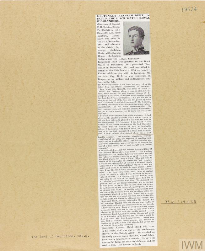 Lieutenant Kenneth Buist. Unit: B Company, 1st Battalion, Black Watch (Royal Highlanders). Death: 25 January 1915 Cuinchy Western Front. Son of Colonel F. B. Buist, of Swalcliffe Lea, Banbury, Oxon.