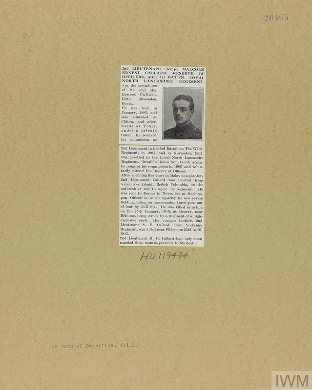 Second Lieutenant (Temporary) Malcolm Ernest Callard. Unit: Reserve of Officers, attached to 1st Battalion, Loyal North Lancashire Regiment. Death: 25 January 1915 Killed in action at Beuvry Western Front