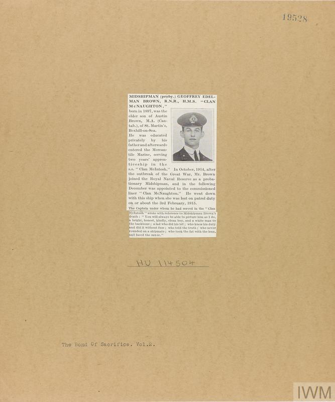Midshipman Geoffrey Edelman Brown. Unit: Royal Naval Reserve, HMS Clan McNaughton. Death: 03 February 1915 At sea
