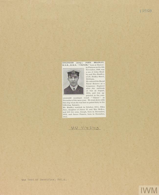 Engineer John Bradley. Unit: HMS Viknor, Royal Naval Reserve. Death: 01 January 1915 At sea