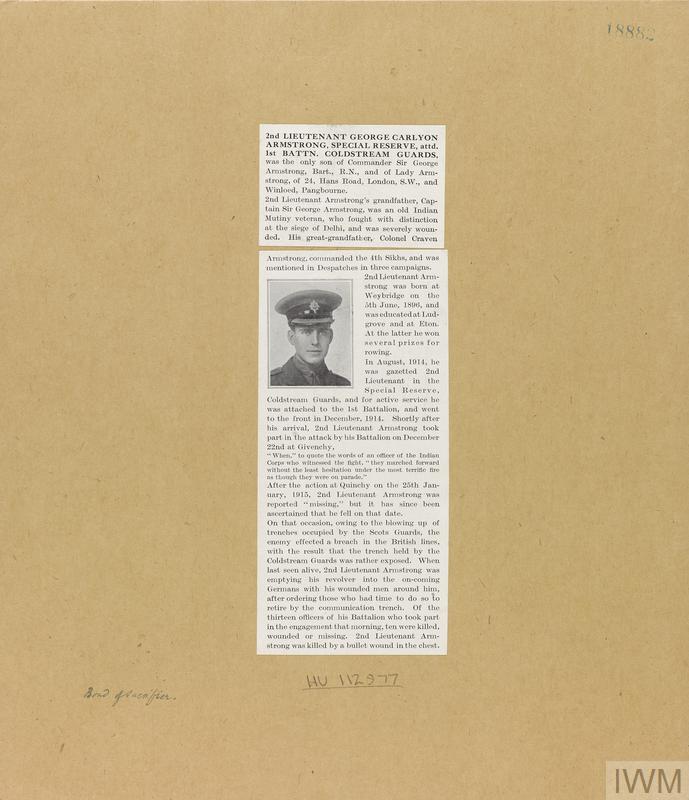 Second Lieutenant George Carlyon Armstrong. Unit: Special Reserve, attached to 1st Battalion, Coldstream Guards. Death: 25 January 1915 Quinchy Western Front