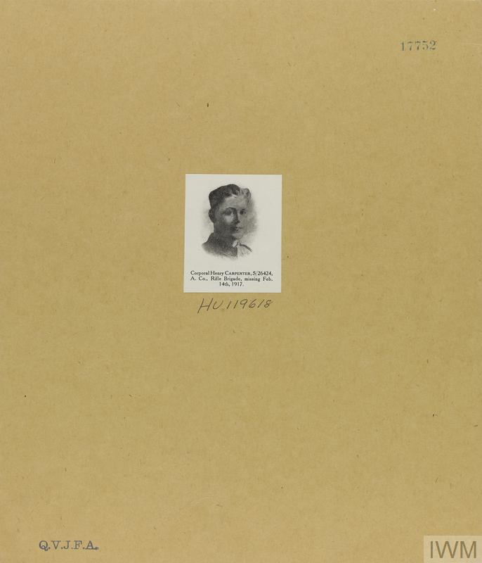 Corporal Henry James Carpenter S/26424. Unit: A Company, 11th Battalion, Rifle Brigade. Death: 14 February 1917 Missing in action presumed Killed in action Western Front