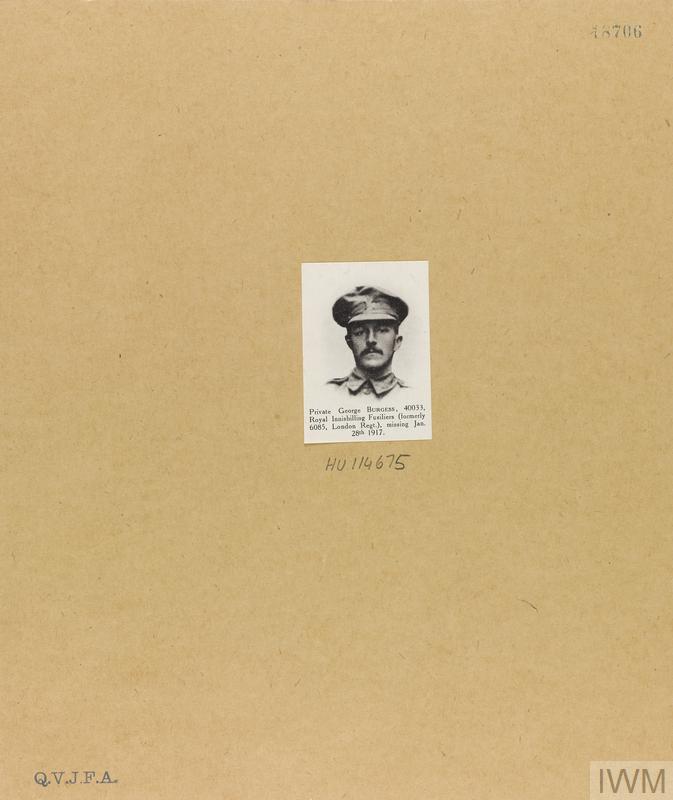 Private George Burgess 40033. Unit: London Regiment, attached to Royal Inniskilling Fusiliers. Death: 28 January 1917 Missing