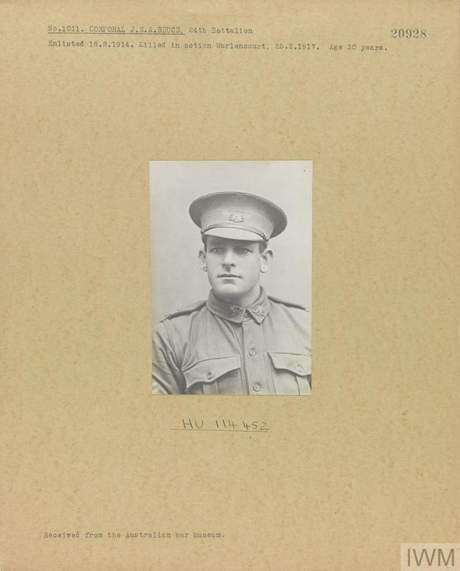 Corporal John Ernest Alexander Bruce 1011. Unit: 24th Battalion, Australian Infantry, Australian Imperial Force. Death: 25 February 1917 Warlencourt Western Front