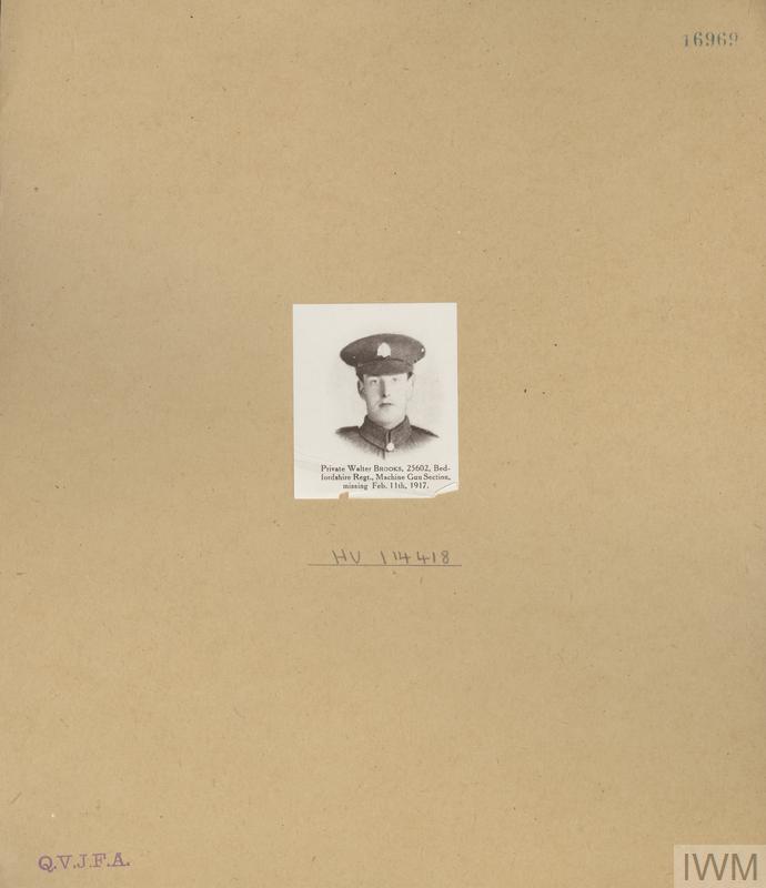 Private Walter Brooks 25602. Unit: Machine Gun Section, 4th Battalion, Bedfordshire Regiment. Death: 11 February 1917 Western Front. Son of Arthur and Amelia Brooks, of Hinxworth, Baldock, Herts.