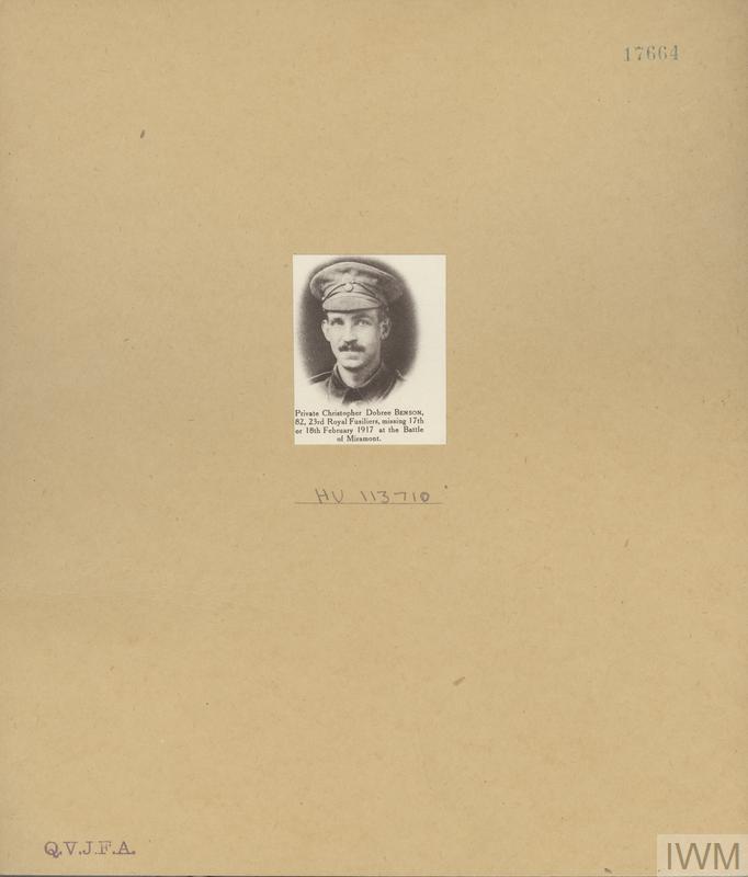 Private Christopher Dobree Benson G/82. Unit: 23rd Battalion, Royal Fusiliers. Death: 17 February 1917 Miramont Western Front