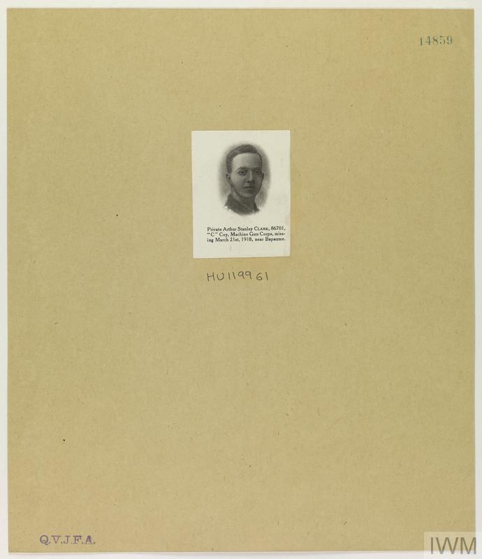Private Arthur Stanley Clark 86701. Unit: C Company, Machine Gun Corps. Death: 21 March 1918 Missing in action near Bapaume Western Front
