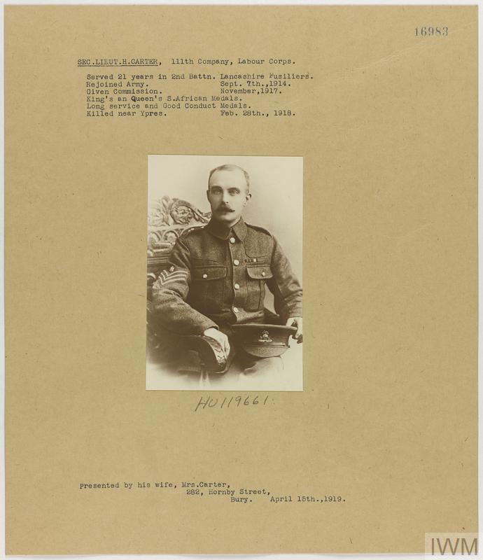 Second Lieutenant Henry Carter. Unit: Lancashire Fusiliers, attached to 111th Company, Labour Corps. Death: 28 February 1918 Killed in action near Ypres Western Front