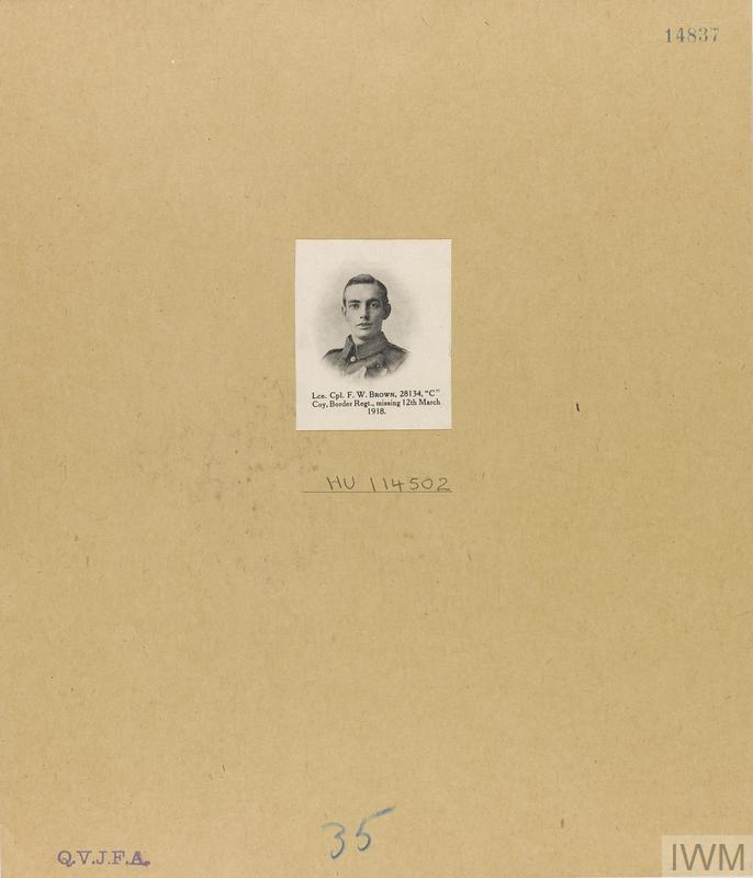 Lance Corporal Frederick W Brown 28134. Unit: C Company, 11th Battalion, Border Regiment. Death: 12 March 1918 Missing Western Front