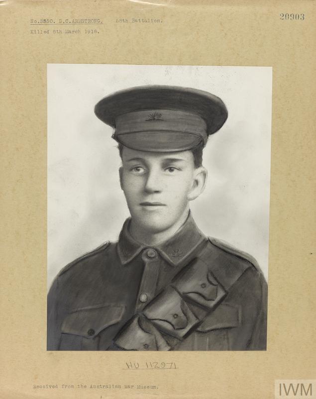 Private David Charles Armstrong 3350. Unit: 58th Battalion, Australian Infantry, Australian Imperial Force. Death: 08 March 1918 Western Front